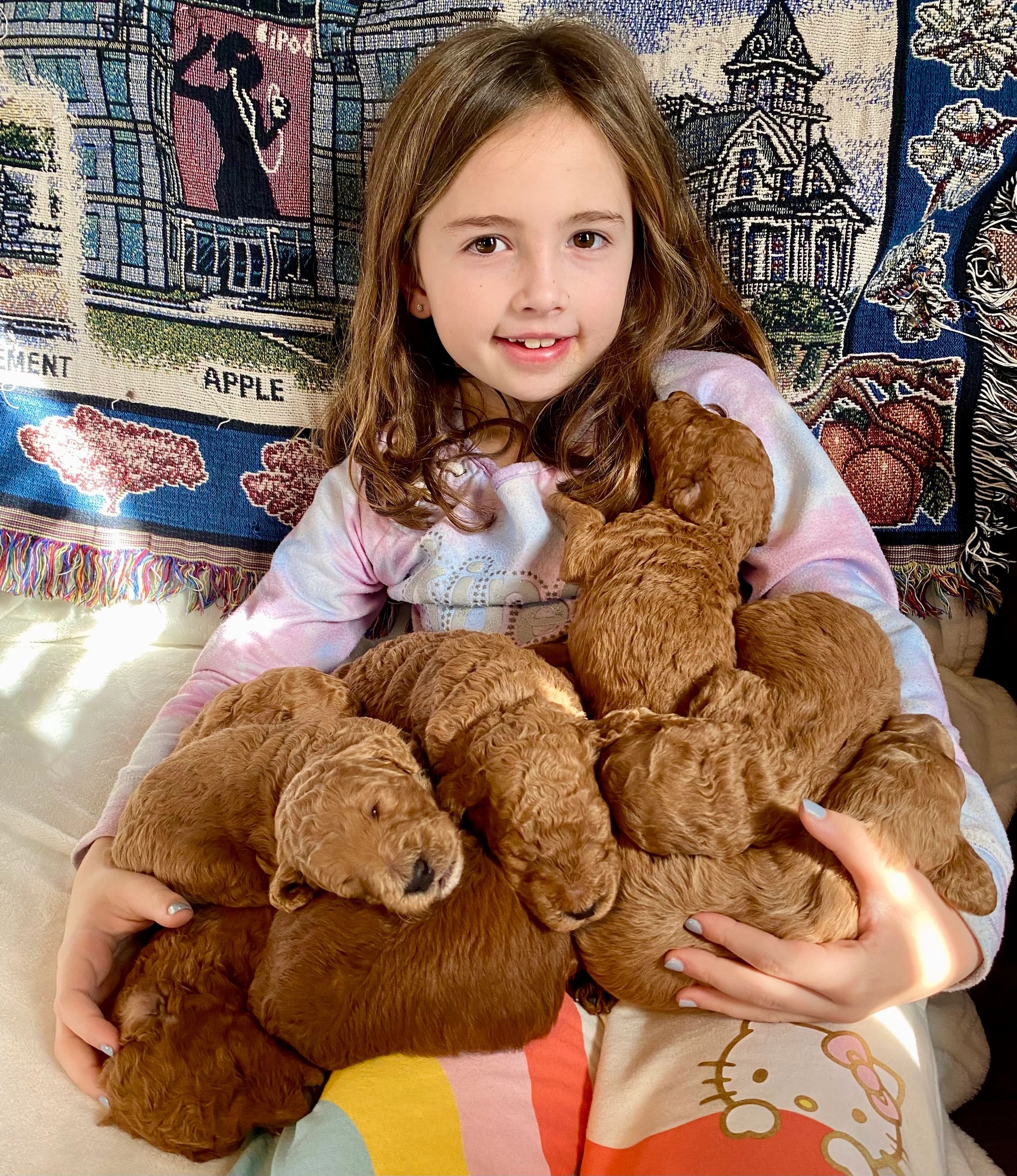 Born and raised in a small town in Western New York, our pups come from a loving home raised with children and other animals. Our dogs are a big part of our family. We will have litters of red goldendoodles, aussiedoodles, red standard and moyen poodles. Our pups will be a nice addition to your family!
